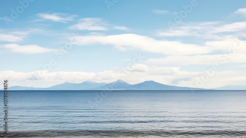 mountain, ocean, water, sky, cloud, blue, calm, serene, peaceful, tranquil, horizon, landscape, view, scenery, nature, beautiful, majestic, huge, expansive, clear, bright, summer, day, sunlight, light, air, atmosphere, distance, far, remote, still, quiet, wave, ripple, gentle, soft, picturesque, breathtaking, amazing, stunning, awesome