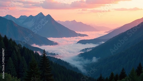 Serene mountain vista at dawn with misty valley below, mountains, morning, forest