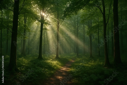 Serene nature sanctuary with filtered sunlight and peaceful woodland atmosphere