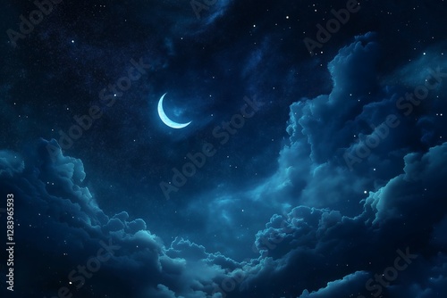 night, sky, crescent, moon, star, cloud, illuminated, serene, tranquil, blue, glow, fluffy, deep, calming, captivating, atmosphere, moonlight, shadow, visual, peaceful, nightscape, scenery, astronomy, celestial, twilight, night time, majestic, lunar, natural, horizon, scenic, atmospheric, stunning, elegant, dark