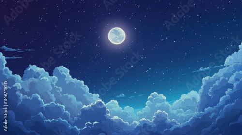 night, sky, moon, full moon, cloud, star, blue, dark blue, peaceful, calm, serene, tranquil, dreamy, magical, beautiful, landscape, nature, background, wallpaper, illustration, art, digital artwork, artwork, drawing, painting, design, graphic, astronomy, celestial, heavenly, cosmos, universe, space, night scene, nightscape, moonlight, cloud cover, atmospheric, romantic, mystical, fantasy, enchanting, evocative, dreamlike, aesthetic, soft, gentle