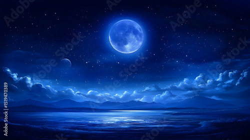 moon, night, star, water, cloud, sky, landscape, blue, celestial, dreamy, serene, horizon, moonlight, fantasy, galaxy, peaceful, quiet, atmosphere, universe, interstellar, cosmos, starry, scenic, space, mystical, aethereal, calmness, calming, ocean, sea, panorama, distant, vista, view, expanse, dark, dusk, twilight, evening, scenery, night time, sublime