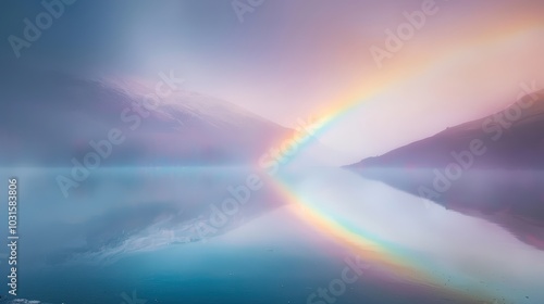 Serene Rainbow Over Misty Lake Landscape