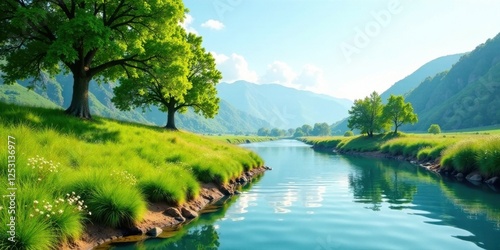 Serene River Landscape with Lush Green Meadows and Majestic Mountains Under a Sunny Sky