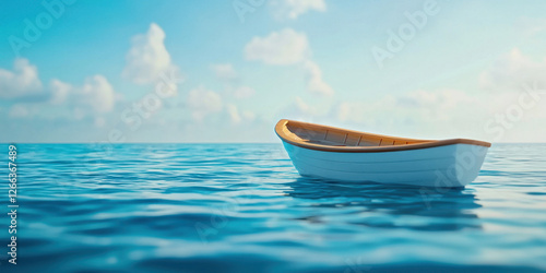serene side profile of boat floating on calm ocean waters under clear blue sky, evoking sense of tranquility and peace