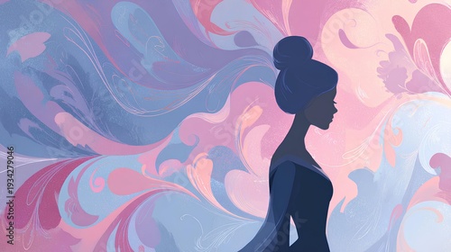 Serene Silhouette: An ethereal illustration features an elegant female figure, her silhouette set against a backdrop of flowing, pastel-colored swirls. A visual poem, embodying grace, tranquility.