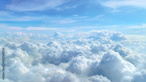 cloud, sky, aerial view, blue, white, tranquil, serene, soft, fluffy, sunlight, peaceful, horizon, bright, atmosphere, up high, endless, expansive, gentle, light, daytime, nature, beauty, overhead, panorama, skyward, elevation, openness, high altitude, calm, vapour, skyline, celestial, scenic, airy, cumulus, ai, realism, photorealistic, realistic