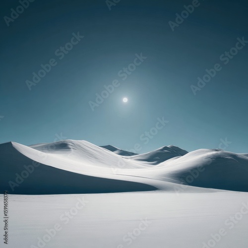 Serene snowscape under a pale sun, minimalist, smooth, undulating snowdrifts against a deep teal sky