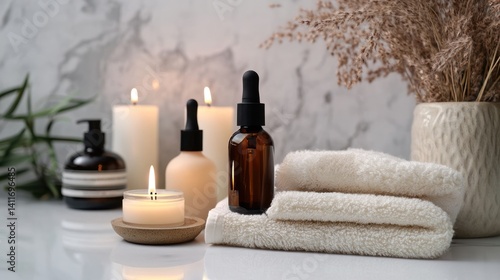 Serene Spa Setting: Amber Bottles, Candles, and Soft Towels