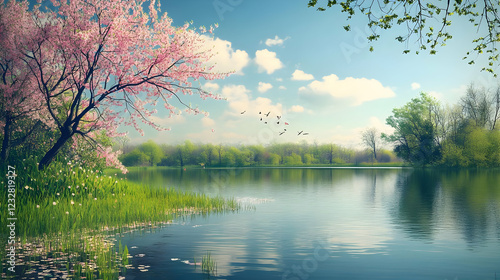 Serene Spring Landscape: Pink Tree by the Lake