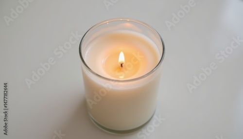 Serene still life, a lit candle on pristine white surface radiating warmth and tranquility