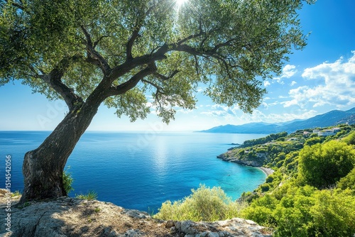 Serene summer view of a leafy tree overlooking a calm blue sea and distant mountains, Tranquil nature and serenity of leisure during summer vacation in Greece