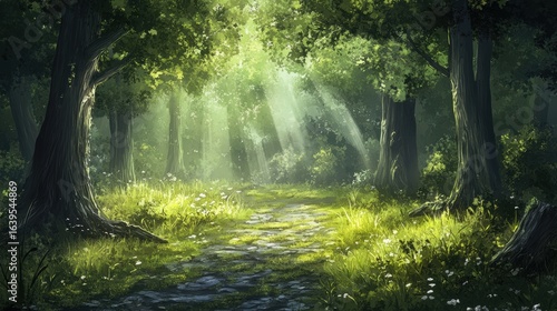 Serene Sunlit Pathway Through Lush Green Forest Surrounded by Majestic Trees and Vibrant Underbrush Illuminated by Warm Sun Rays