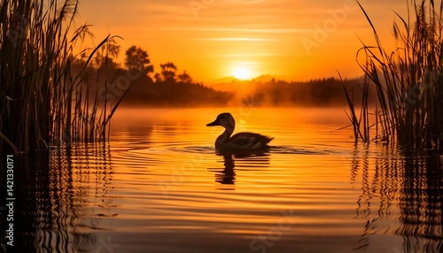 Serene Sunrise Duck Silhouette on Calm Lake Waters
