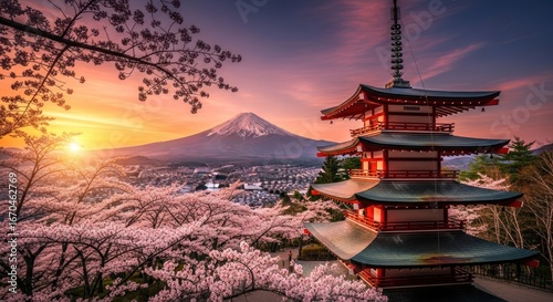 mount fuji, japan, sunrise, sunset, cherry blossom, sakura, spring, pagoda, temple, architecture, asian, red, pink, nature, landscape, scenic, beautiful, peaceful, serene, tranquil, calm, vibrant, colourful, majestic, mountain, tree, flower, blossom, travel, tour tourism, photo, picturesque, idylli, postcard, view, panorama, stunning, spiritual, traditional, culture, heritage, asia, east asia, iconic, symbol, landmark