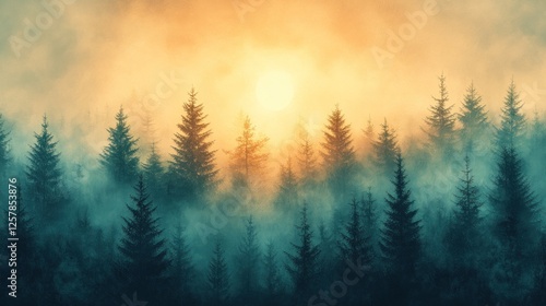 Serene sunrise over a misty forest landscape, with silhouettes of pine trees and a glowing sun
