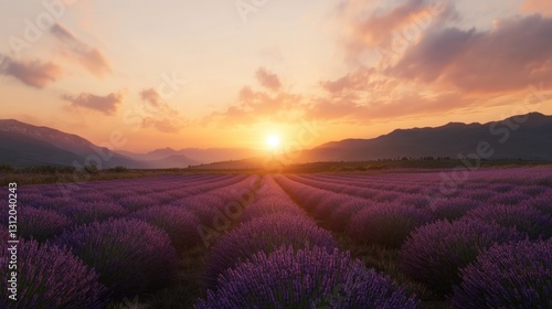 Serene Sunrise Over Lavender Fields with Blossoming Purple Flowers and Soft Mountains in Background Under a Beautiful Sky