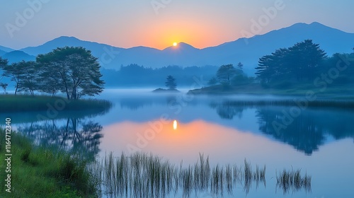 Serene Sunrise Over Misty Mountain Lake