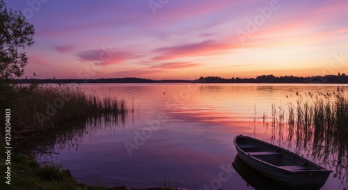 sunset, lake, dinghy, landscape, calm, serene, peaceful, purple, pink, sky, water, nature, photo, image, background, desktop, beautiful, tranquil, evening, twilight, still, colours, vibrant, scenic, idylli, romantic, picturesque, travel, destination, vacation, holiday, relaxing, mood, download, hi-res