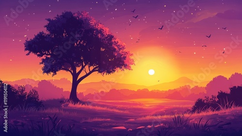 sunset, landscape, tree, bird, sky, sun, horizon, field, grass, hill, mountain, purple, orange, pink, vibrant, colours, nature, scenery, tranquil, peaceful, calm, serene, evening, twilight, dusk, majestic, beautiful, picturesque, idylli, dreamy, artistic, illustration, digital, art, design, graphic, artwork, image, picture, photo, view, scene