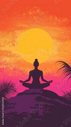Serene Sunset Meditation: A silhouette of a figure in a cross-legged pose meditates against a backdrop of a vibrant sunset, conveying a sense of peace, tranquility, and spiritual connection.