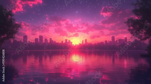 Serene sunset over a city skyline reflecting on a tranquil lake with vibrant colors and clouds