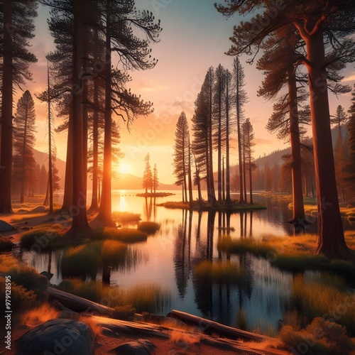 Serene Sunset Over a Lake Surrounded by Lush Trees and Grass