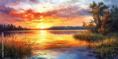 Serene sunset over a tranquil lake, capturing the beauty of the landscape in golden hues as the sun sets, creating a picturesque view with reflections on the water and vibrant colors in the sky.