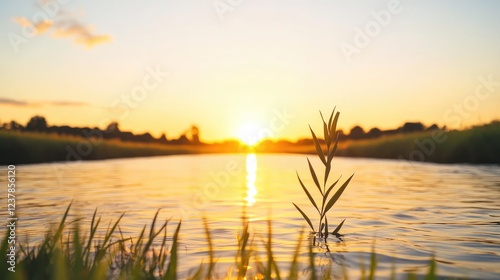 Serene sunset over a tranquil river with grass and a lone plant silhouetted against the sky