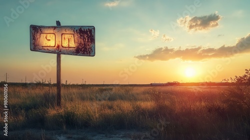 "Serene Sunset Over Grassy Fields with Vintage Sign"