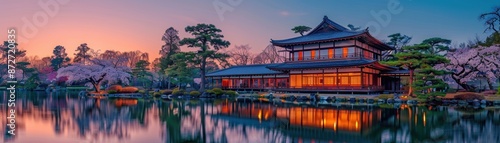 Serene sunset over traditional Japanese temple, reflecting on calm lake surrounded by lush greenery and blossoming cherry trees.