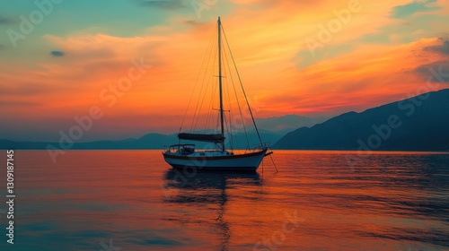 Serene Sunset Sailboat, picturesque sunset over calm waters with a sailboat gently anchored, creating a peaceful and captivating scene.