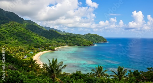 Serene Tropical Beach Paradise Lush Green Hills and Azure Ocean