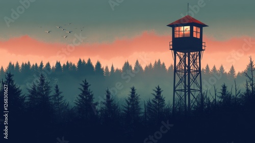 Serene Watchtower at Sunset amidst Lush Forest and Soaring Birds in a Misty Landscape