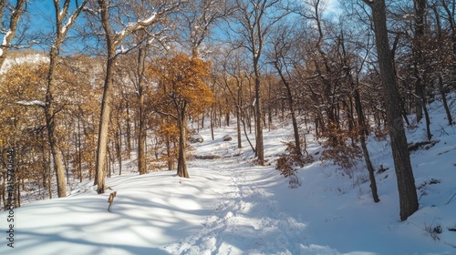 Serene Winter Forest Landscape with Snow Covered Trees Bright Sunny Day Tranquil Pathway in a Winter Wonderland Copy Space for Text