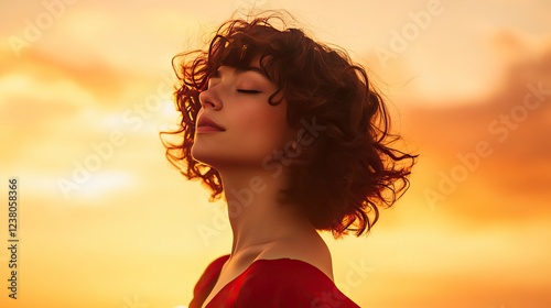 meditation, sunset, serene, woman, curly, hair, closed, eye, red, dress, orange, sky, mountain, peace, nature, connection, beauty, facial, feature, wind, short, curl, calm, tranquil, harmony, spirituality, yoga, mindfulness, contemplation, serenity, landscape, scenic, evening, twilight, atmosphere, glow, light, silhouette, natural, environment, relaxation, well-being, balance, picturesque, aura