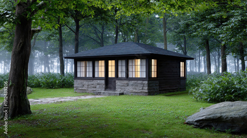 Serene wooden cabin nestled in a lush forest with soft morning light illuminating the windows and surrounded by greenery and trees