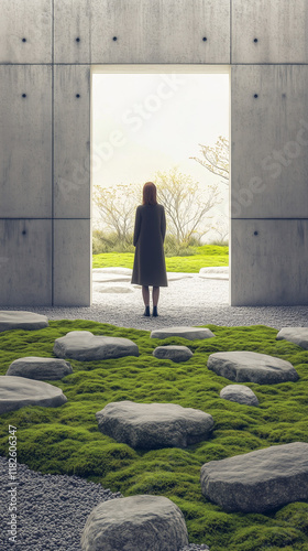 photo, zen, garden, serene, modern, architecture, minimalist, moss, stone, grey, linear, concrete, wall, rectangular, opening, peaceful, enclosed, calmness, elegance, model, standing, vibrant, smooth, clean, space
