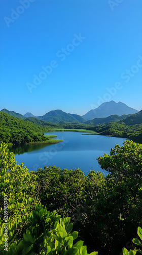 Serenity of a Sprawling Reservoir Encircled by Lush Greenery and Majestic Mountains Amidst a Clear Sky