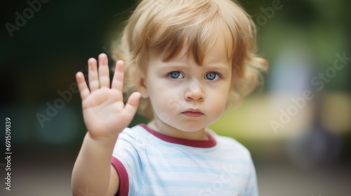 Serious child holding up hand in stop or rejection sign. Little person showing disagreement. Outdoor background.