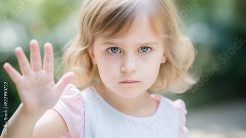 Serious child holding up hand in stop or rejection sign. Little person showing disagreement. Outdoor background.