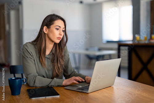 Serious millennial woman using laptop sitting at the table in a home office, typing, communicating online, writing emails, distantly working or studying on computer at home.