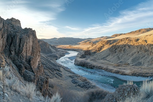 Serpentine River Winding Through a Rugged Canyon at Sunrise