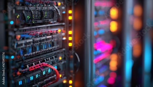 Server racks glow with colorful lights showing red network cables connecting the data hardware