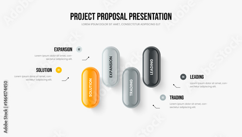 Service Development Slideshow Template Vector Illustration. Investor Report Four Option Diagram Frame Design. Market Review 4 Step Infographic Slide Layout.