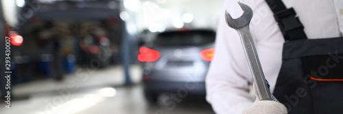 Serviceman in white protective gloves hold matall key in hand against car service station background