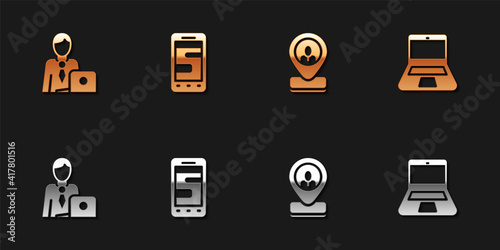 Set Businessman, Chat messages on phone, Worker location and Laptop icon. Vector.