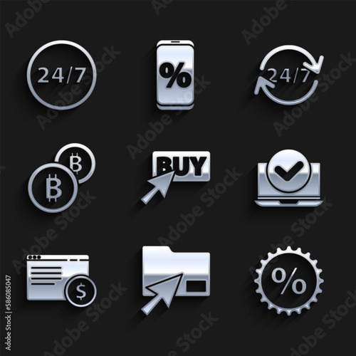 Set Buy button, Cursor click document folder, Discount percent tag, Laptop, Online shopping screen, Cryptocurrency coin Bitcoin, Clock 24 hours and icon. Vector
