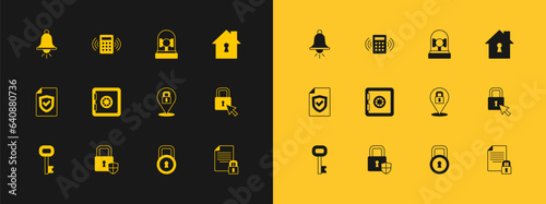 Set House under protection, Shield security with lock, Lock, Safe, Ringing alarm bell, and Security keypad access panel icon. Vector