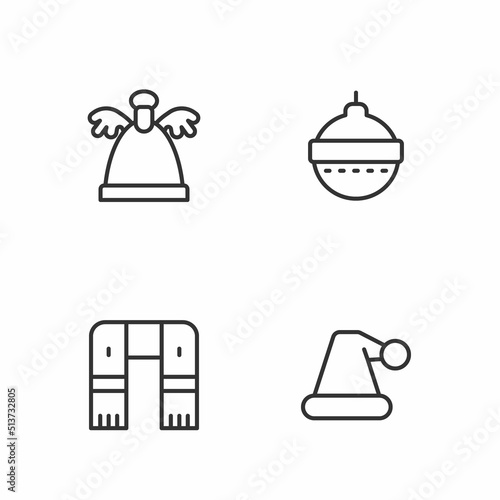 Set line Christmas Santa Claus hat, Winter scarf, Angel and ball icon. Vector